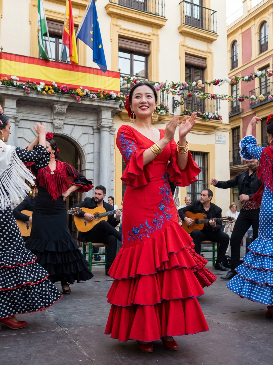 model at a Spanish flamenco festival, wearing a vibrant red dress with blue and gold accessories , surrounded by dancers and musicians, historic plaza decorated with European flags and flowers