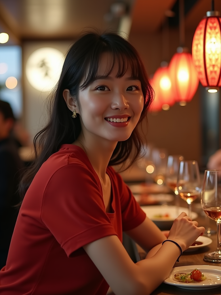 model at a Tokyo izakaya restaurant, wearing smart casual evening wear , enjoying Japanese cuisine