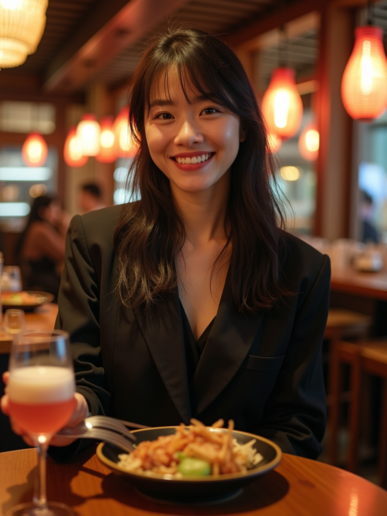model at a Tokyo izakaya restaurant, wearing smart casual evening wear , enjoying Japanese cuisine
