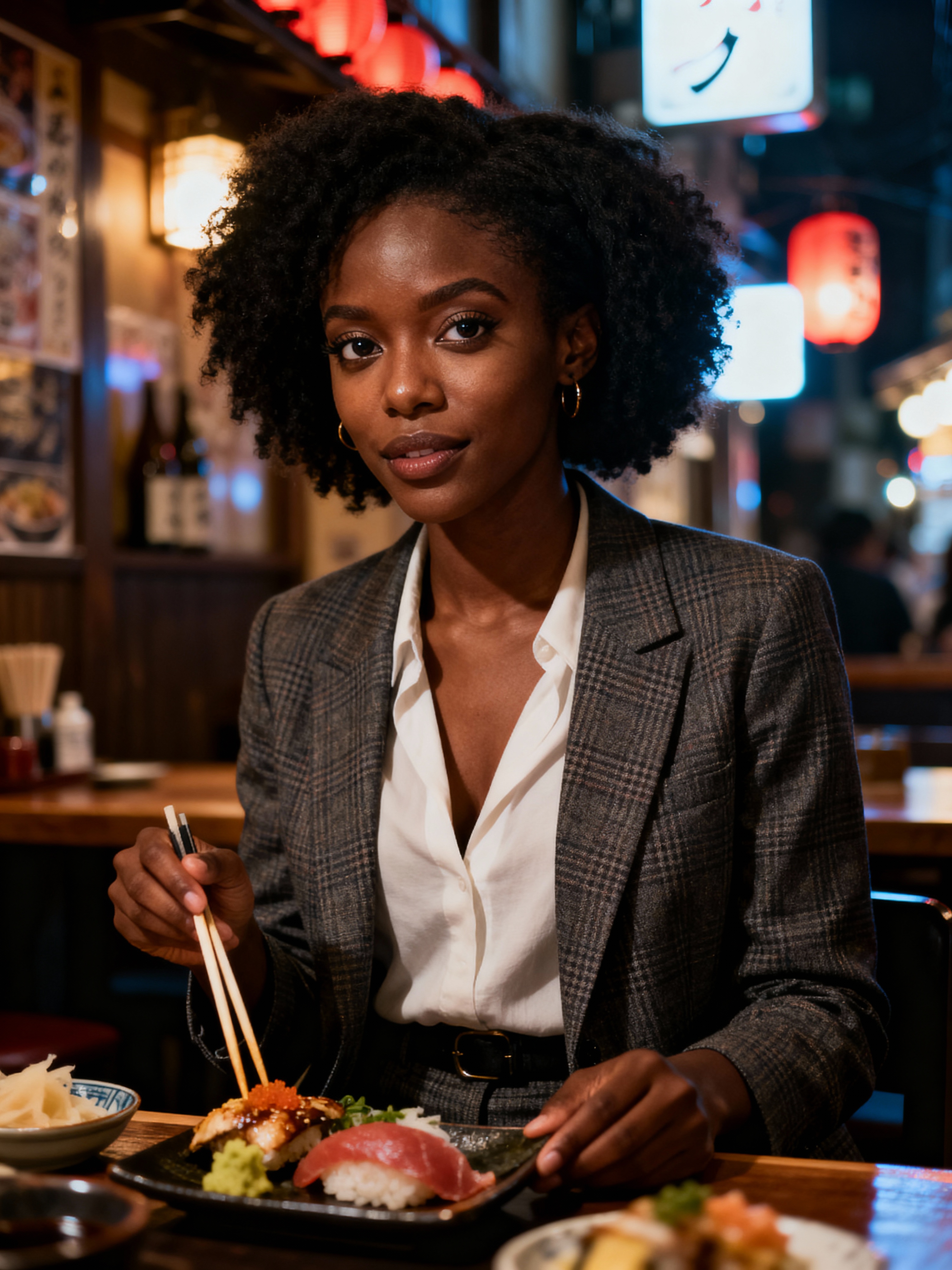 model at a Tokyo izakaya restaurant, wearing smart casual evening wear , enjoying Japanese cuisine