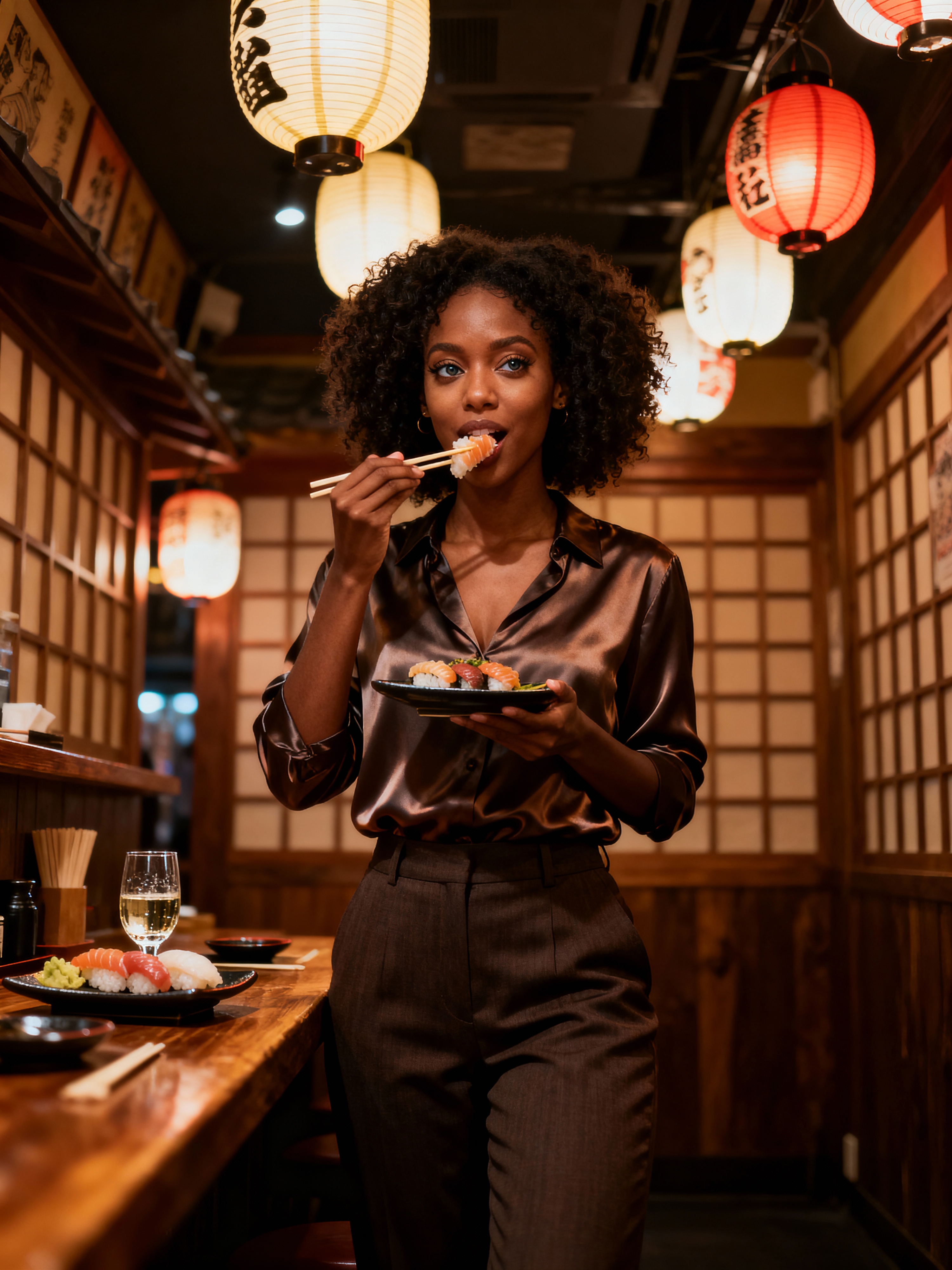 model at a Tokyo izakaya restaurant, wearing smart casual evening wear , enjoying Japanese cuisine