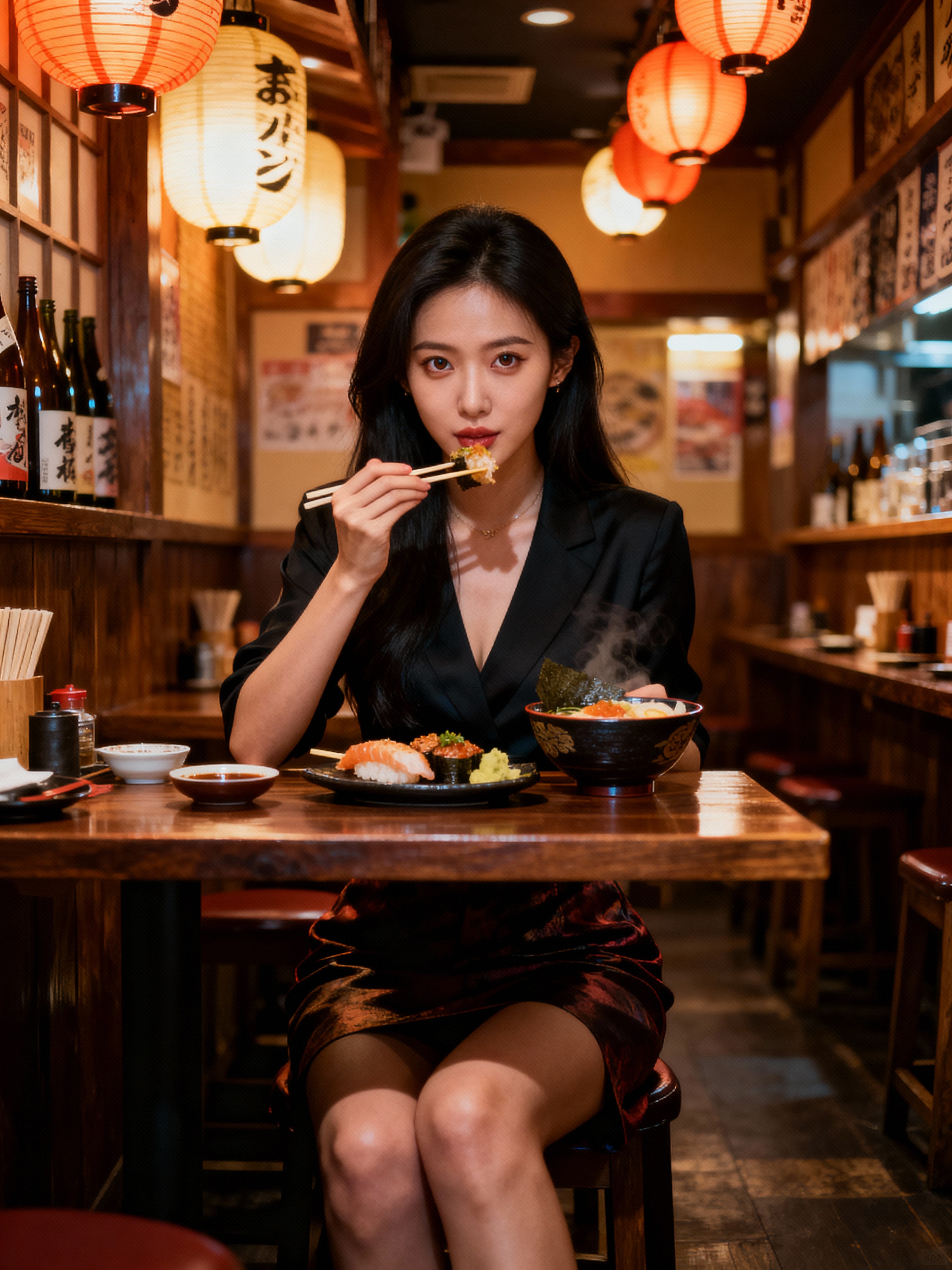model at a Tokyo izakaya restaurant, wearing smart casual evening wear , enjoying Japanese cuisine