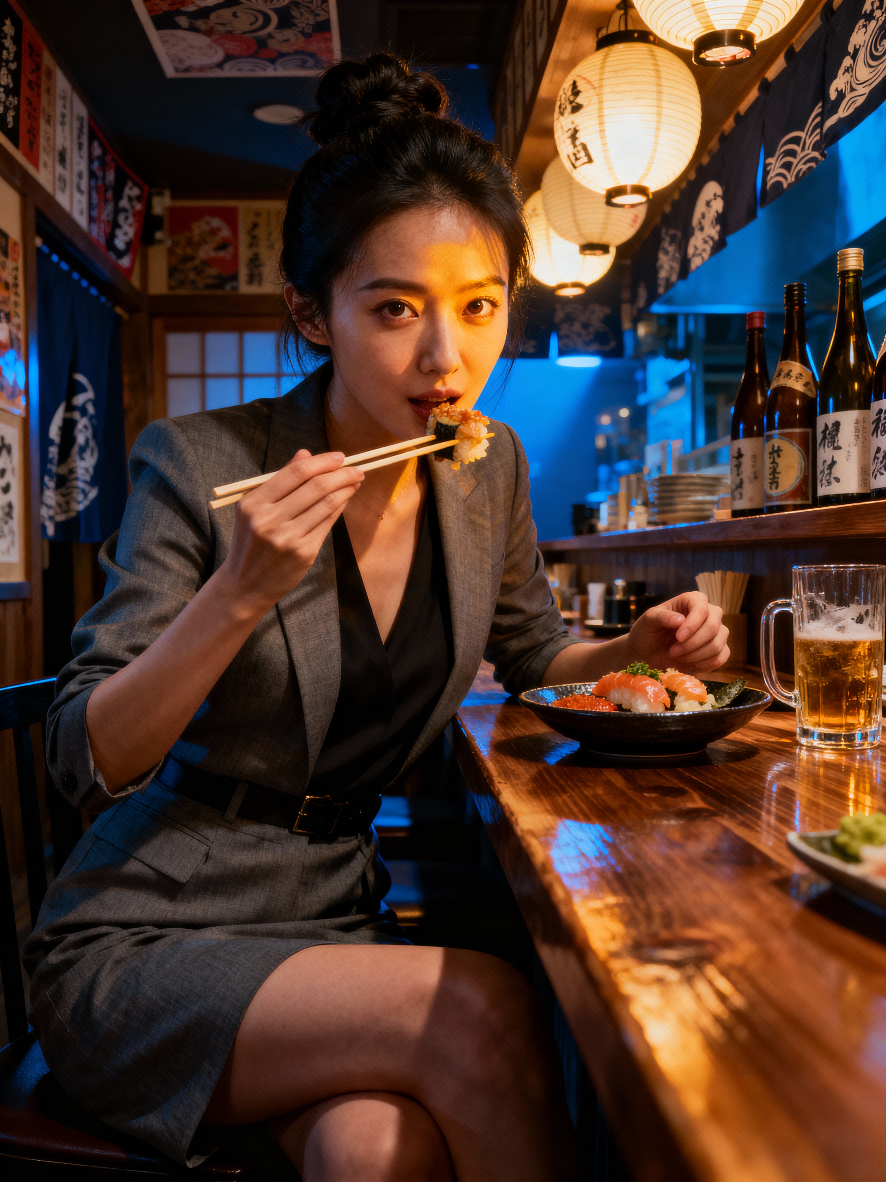 model at a Tokyo izakaya restaurant, wearing smart casual evening wear , enjoying Japanese cuisine