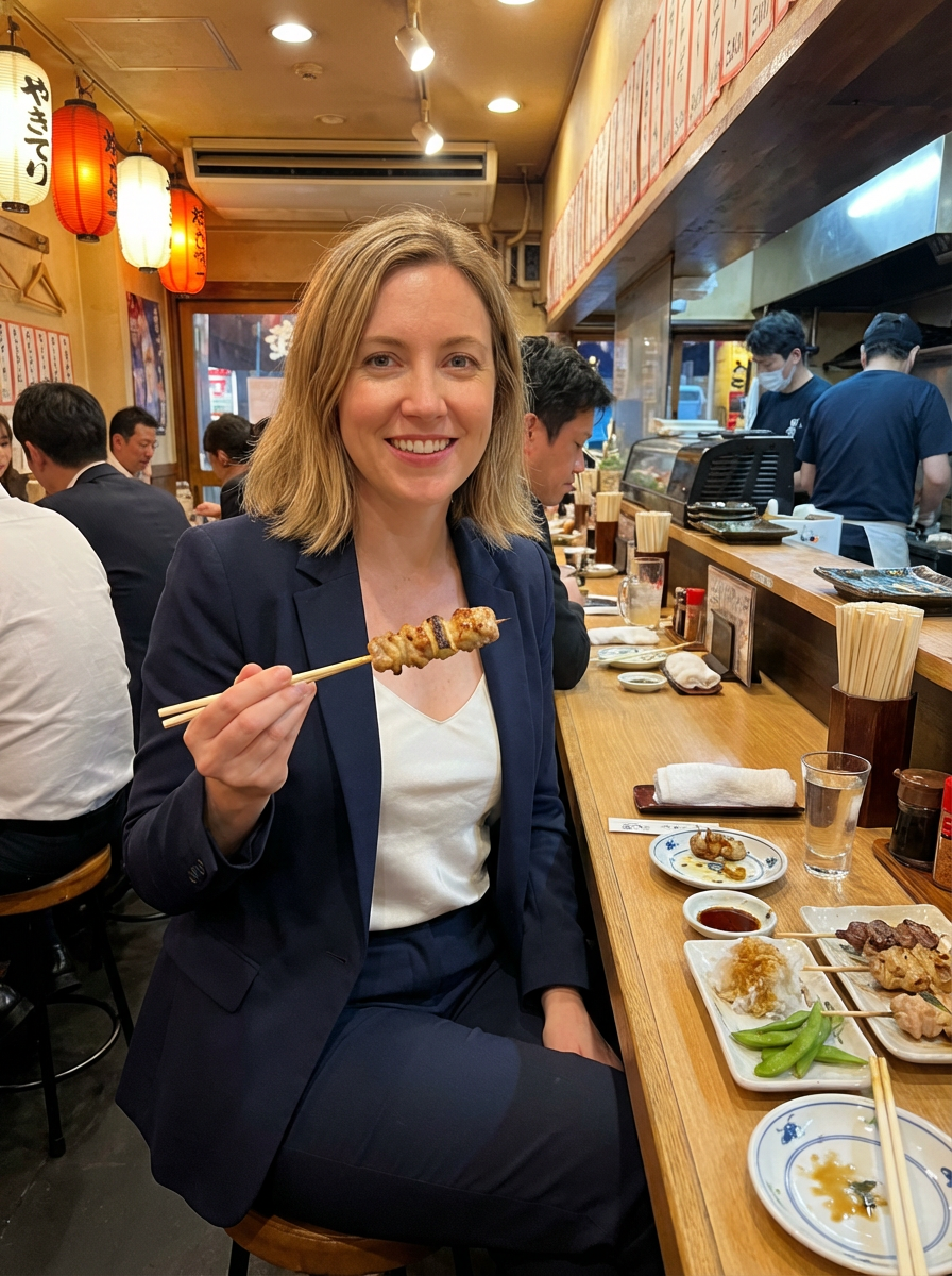 model at a Tokyo izakaya restaurant, wearing smart casual evening wear , enjoying Japanese cuisine
