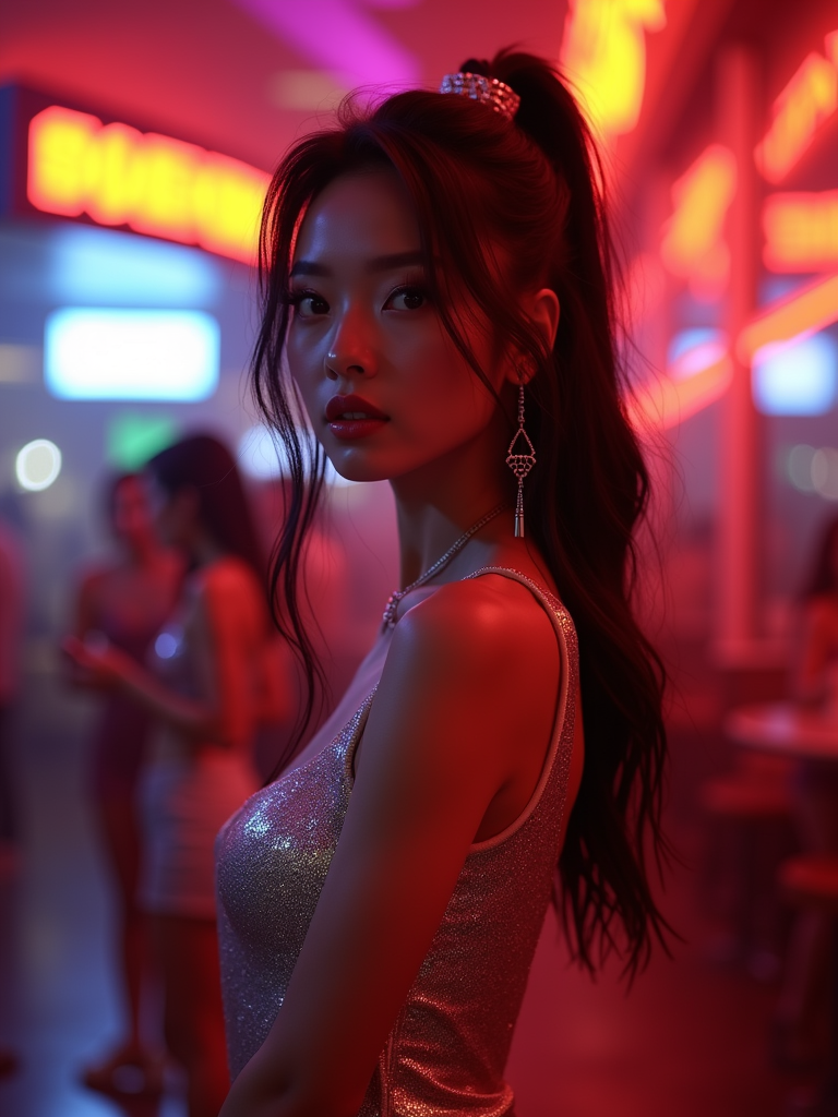 model at a trendy nightclub in Las Vegas. at night. the model sports a bold and fashionable club outfit, like a metallic dress or sleek jumpsuit.