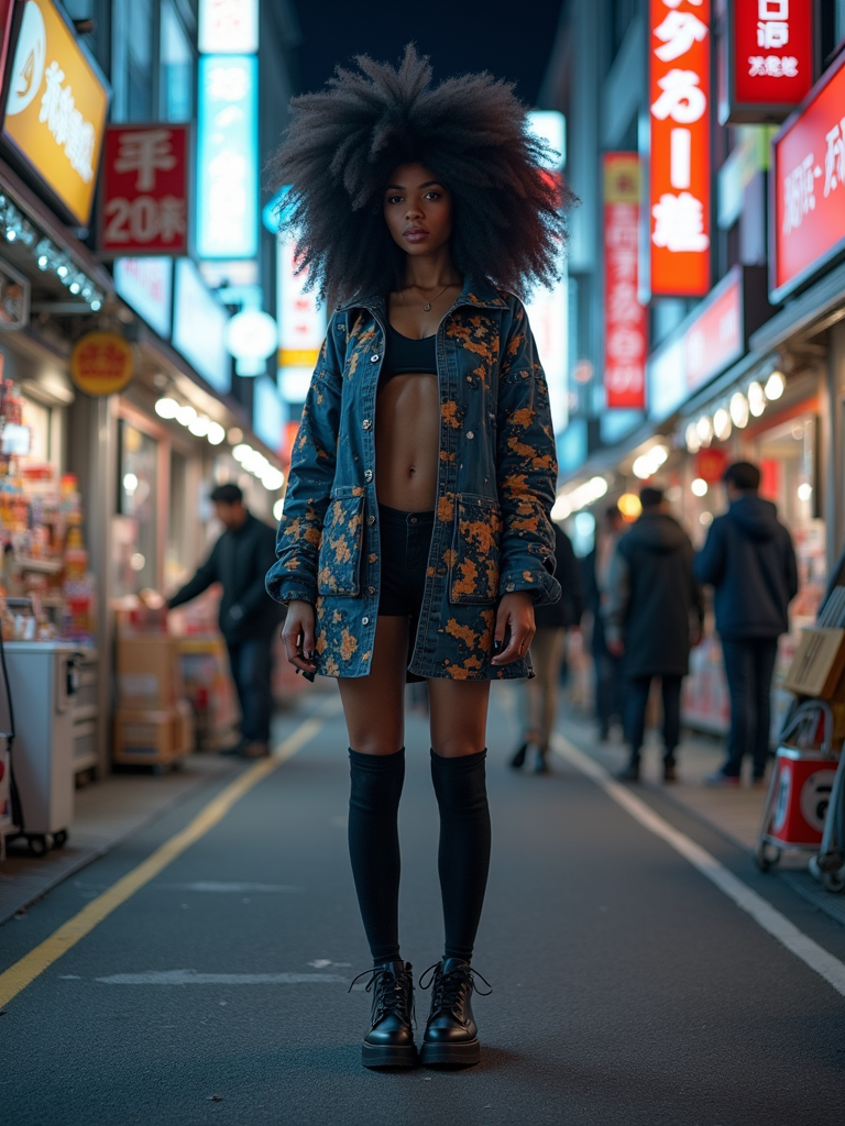 model at Akihabara electric town, wearing anime-inspired fashion with knee-high socks , surrounded by electronics