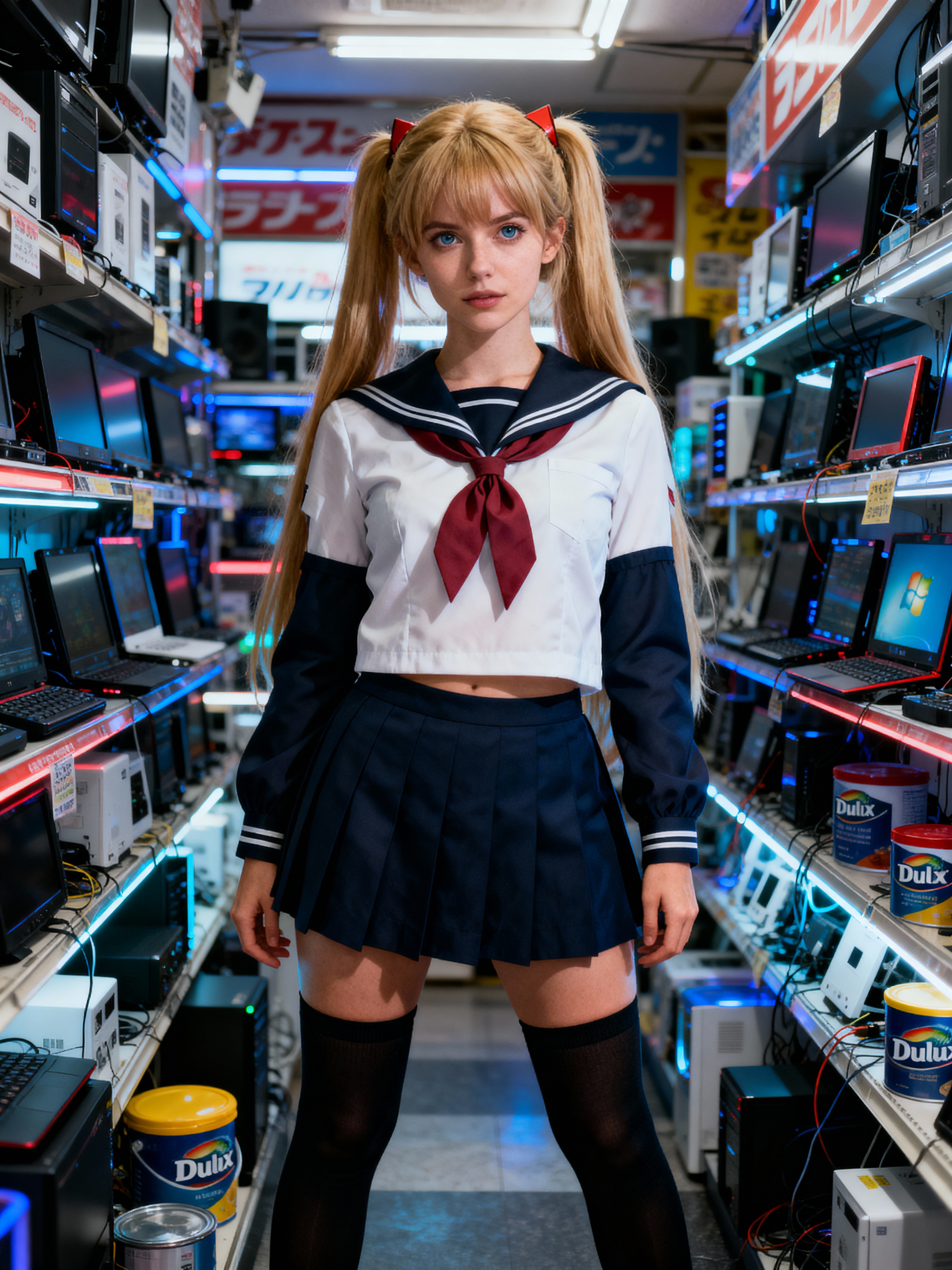 model at Akihabara electric town, wearing anime-inspired fashion with knee-high socks , surrounded by electronics