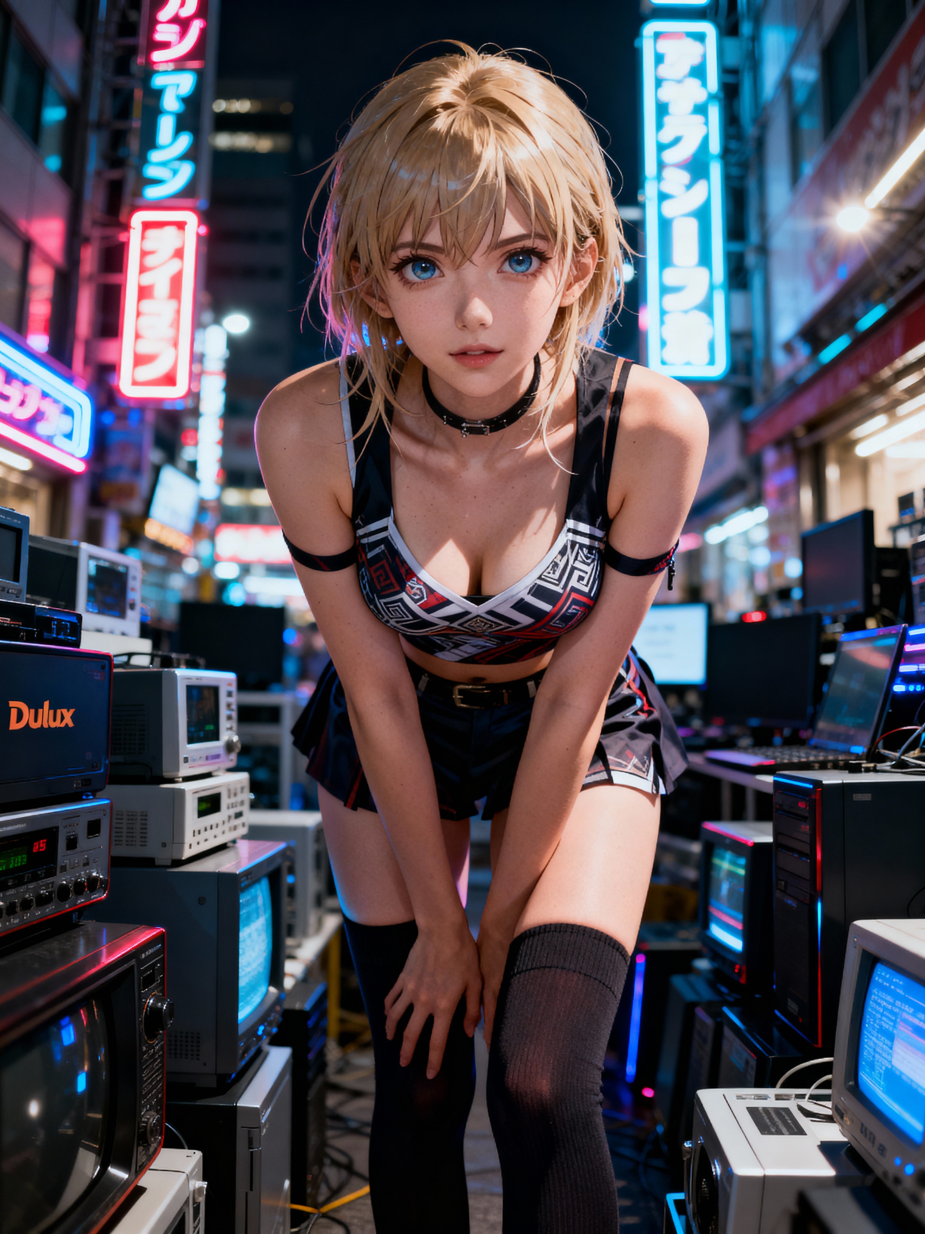 model at Akihabara electric town, wearing anime-inspired fashion with knee-high socks , surrounded by electronics