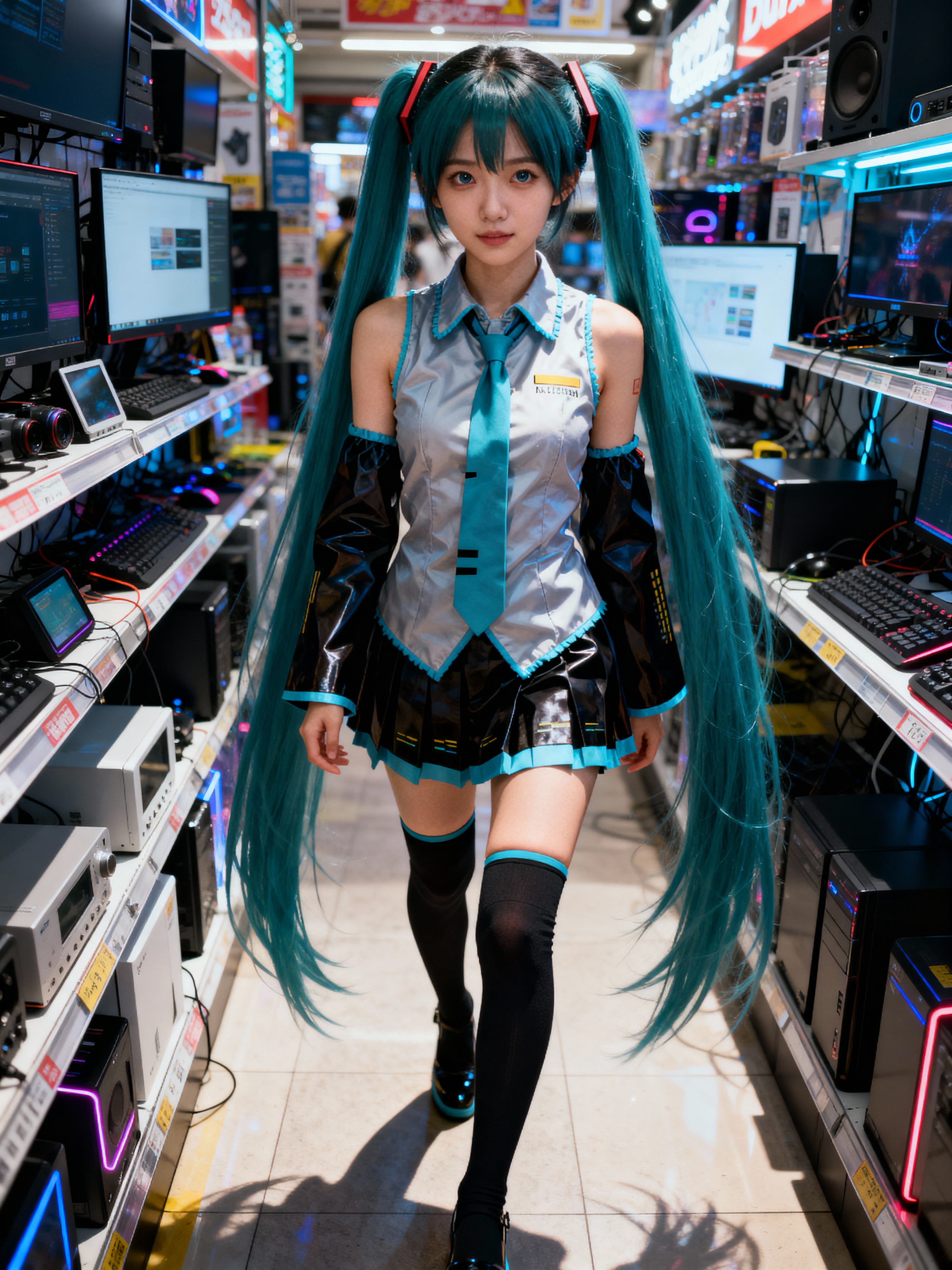 model at Akihabara electric town, wearing anime-inspired fashion with knee-high socks , surrounded by electronics