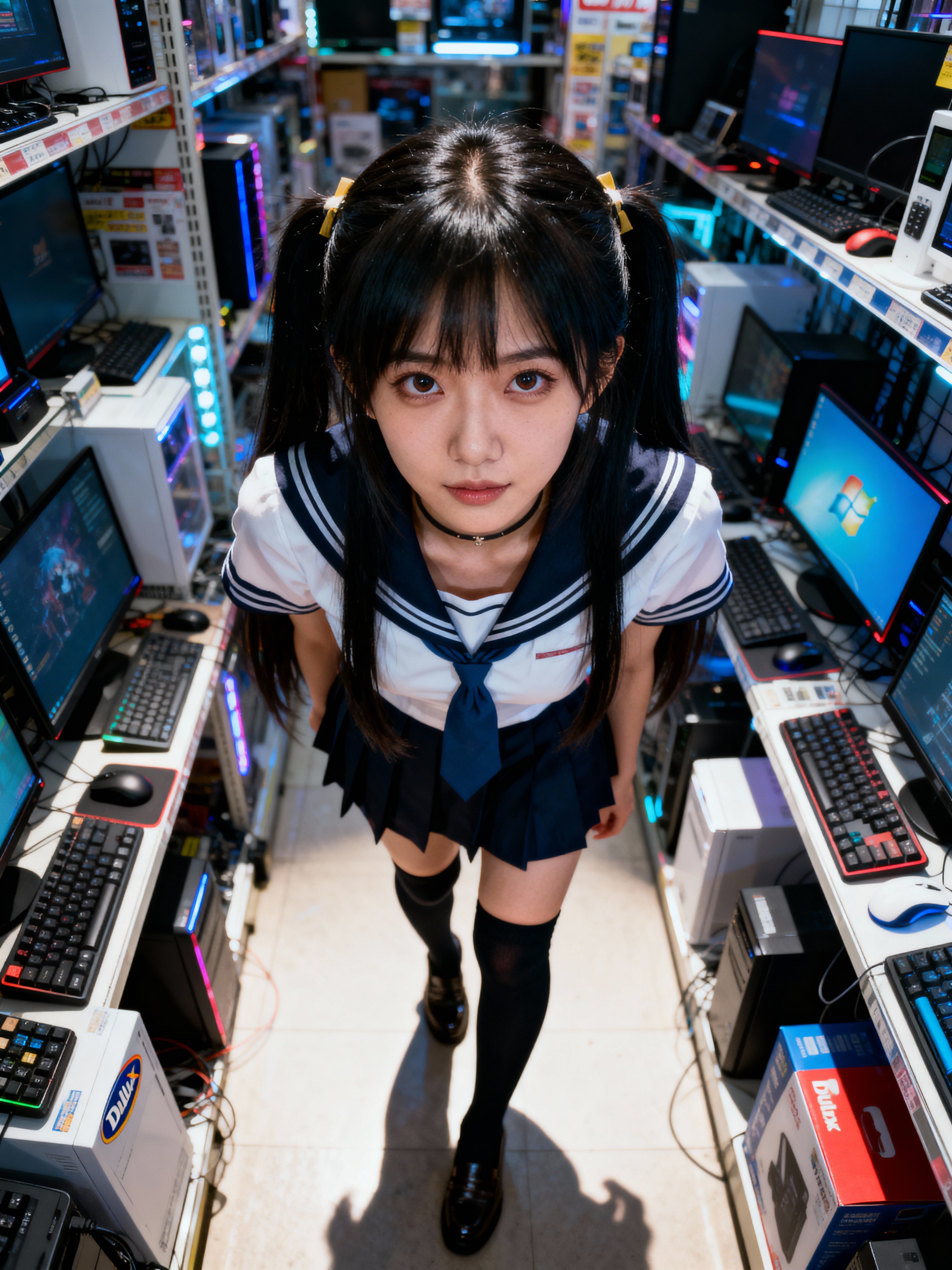 model at Akihabara electric town, wearing anime-inspired fashion with knee-high socks , surrounded by electronics