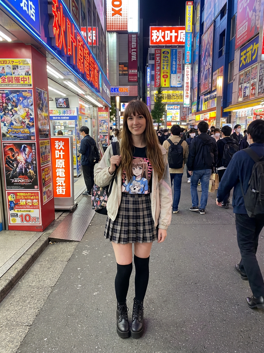 model at Akihabara electric town, wearing anime-inspired fashion with knee-high socks , surrounded by electronics
