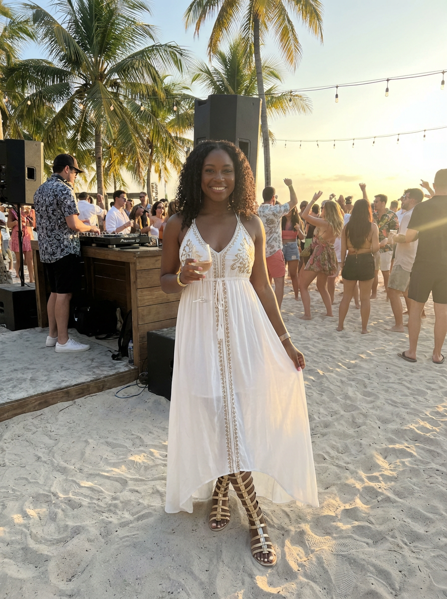 model at an exclusive beach party, wearing a glamorous white resort dress with gold sandals , DJ booth and dancing crowd visible
