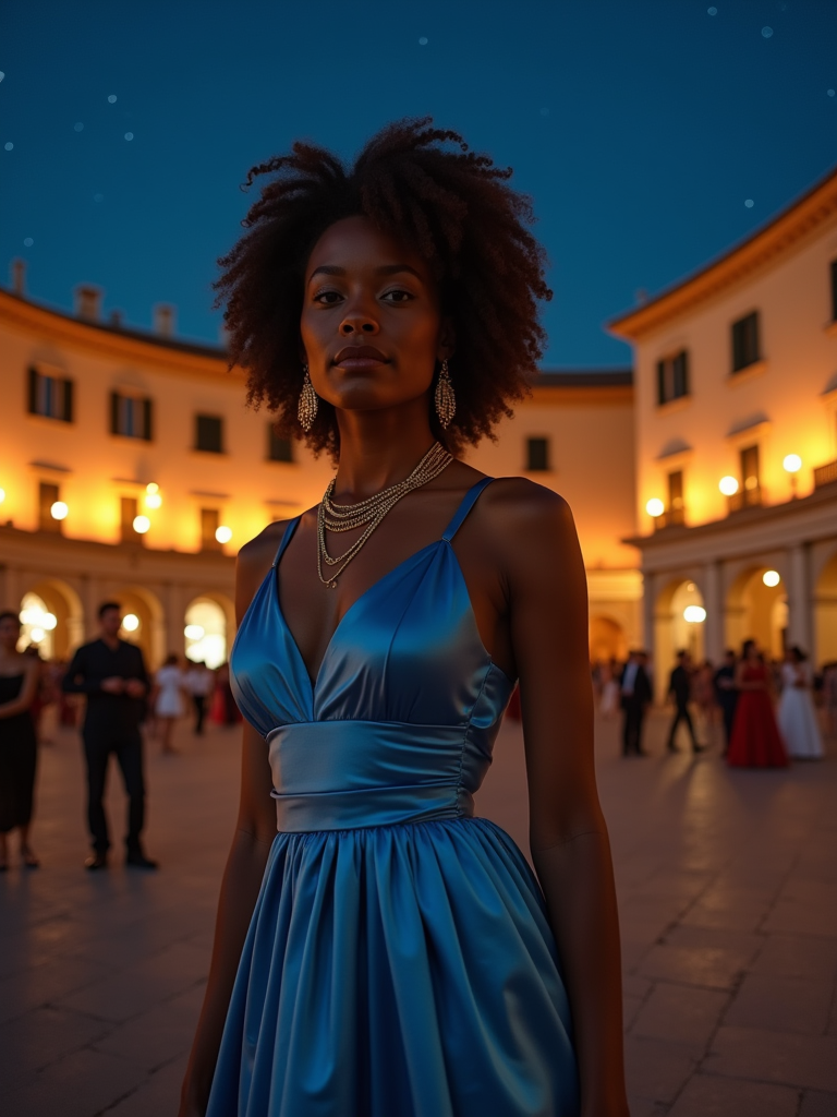 model at an outdoor opera in Verona's ancient Roman arena, wearing a sophisticated blue evening gown with gold accessories , under a starry Mediterranean night sky, surrounded by historic architecture illuminated by warm lights