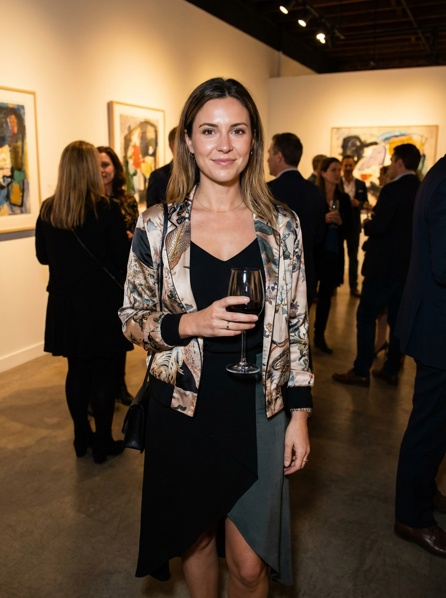 model at art gallery opening, sophisticated creative vibe, fashionable unique outfit