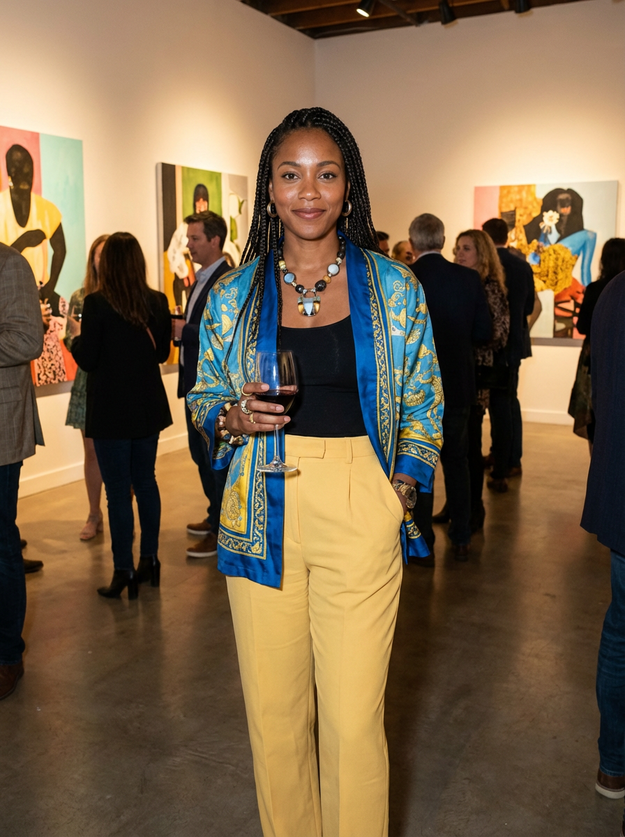 model at art gallery opening, sophisticated creative vibe, fashionable unique outfit