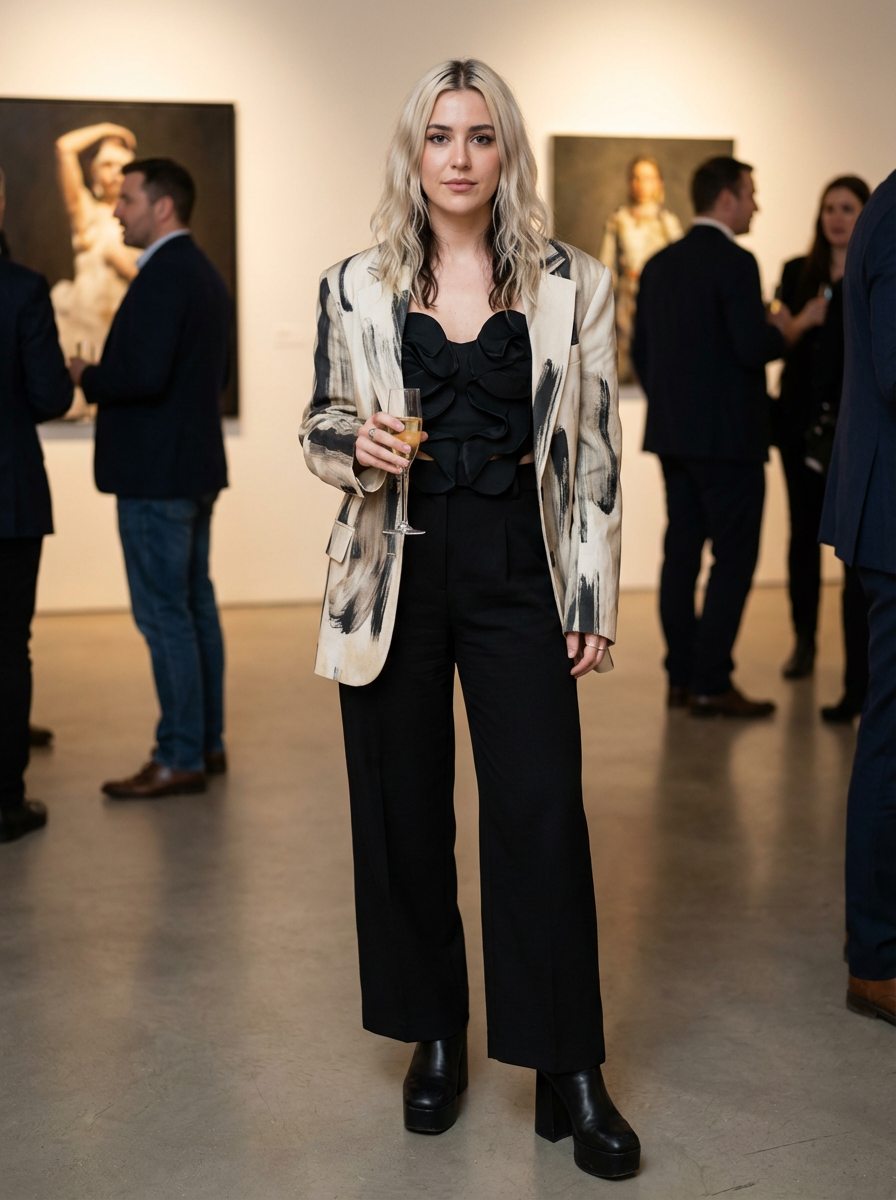 model at art gallery opening, sophisticated creative vibe, fashionable unique outfit