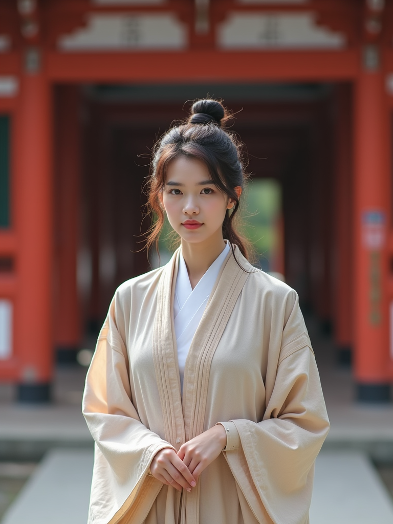 model at Asakusa temple, wearing a modest summer dress with light scarf , traditional architecture visible
