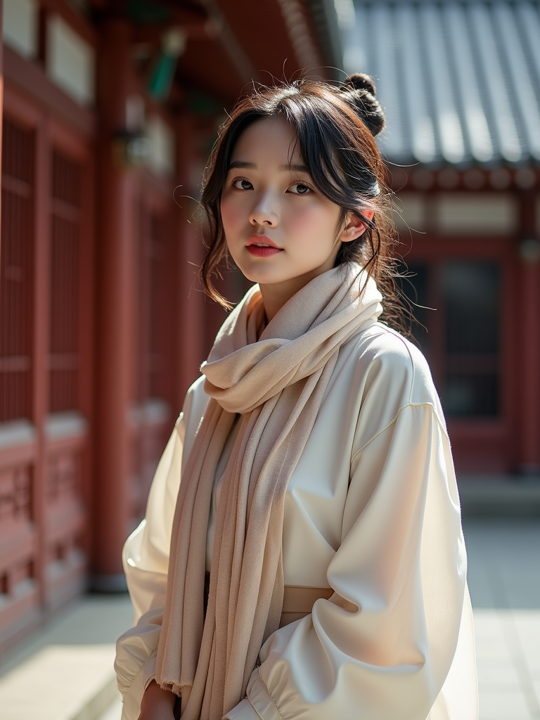 model at Asakusa temple, wearing a modest summer dress with light scarf , traditional architecture visible
