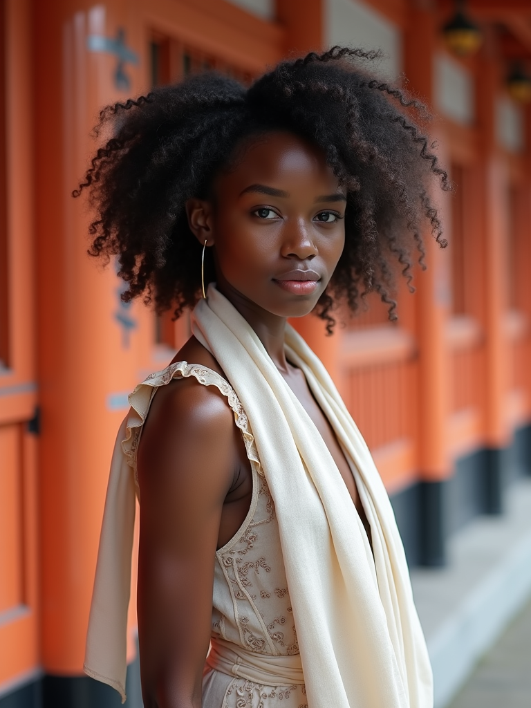 model at Asakusa temple, wearing a modest summer dress with light scarf , traditional architecture visible