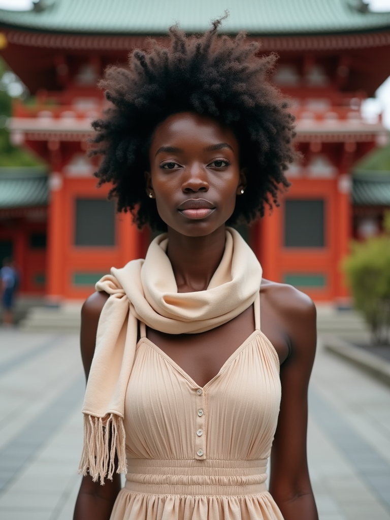 model at Asakusa temple, wearing a modest summer dress with light scarf , traditional architecture visible