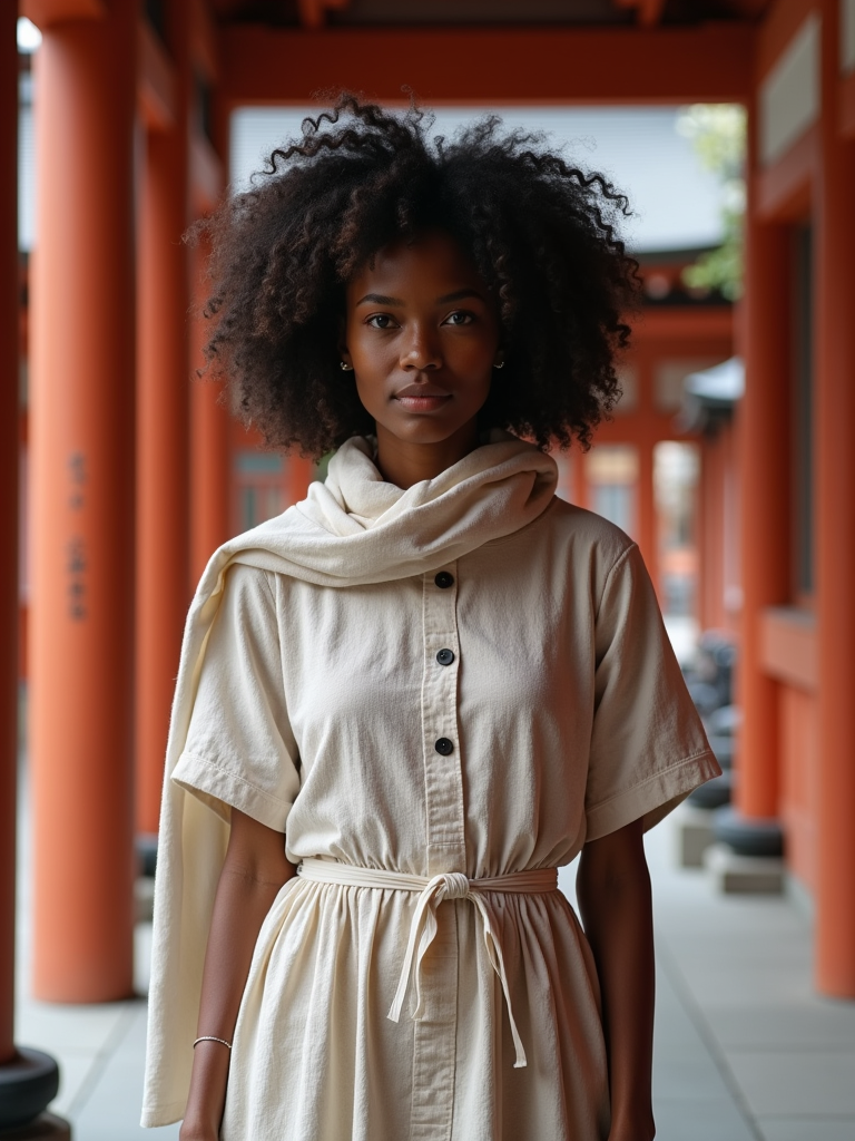 model at Asakusa temple, wearing a modest summer dress with light scarf , traditional architecture visible