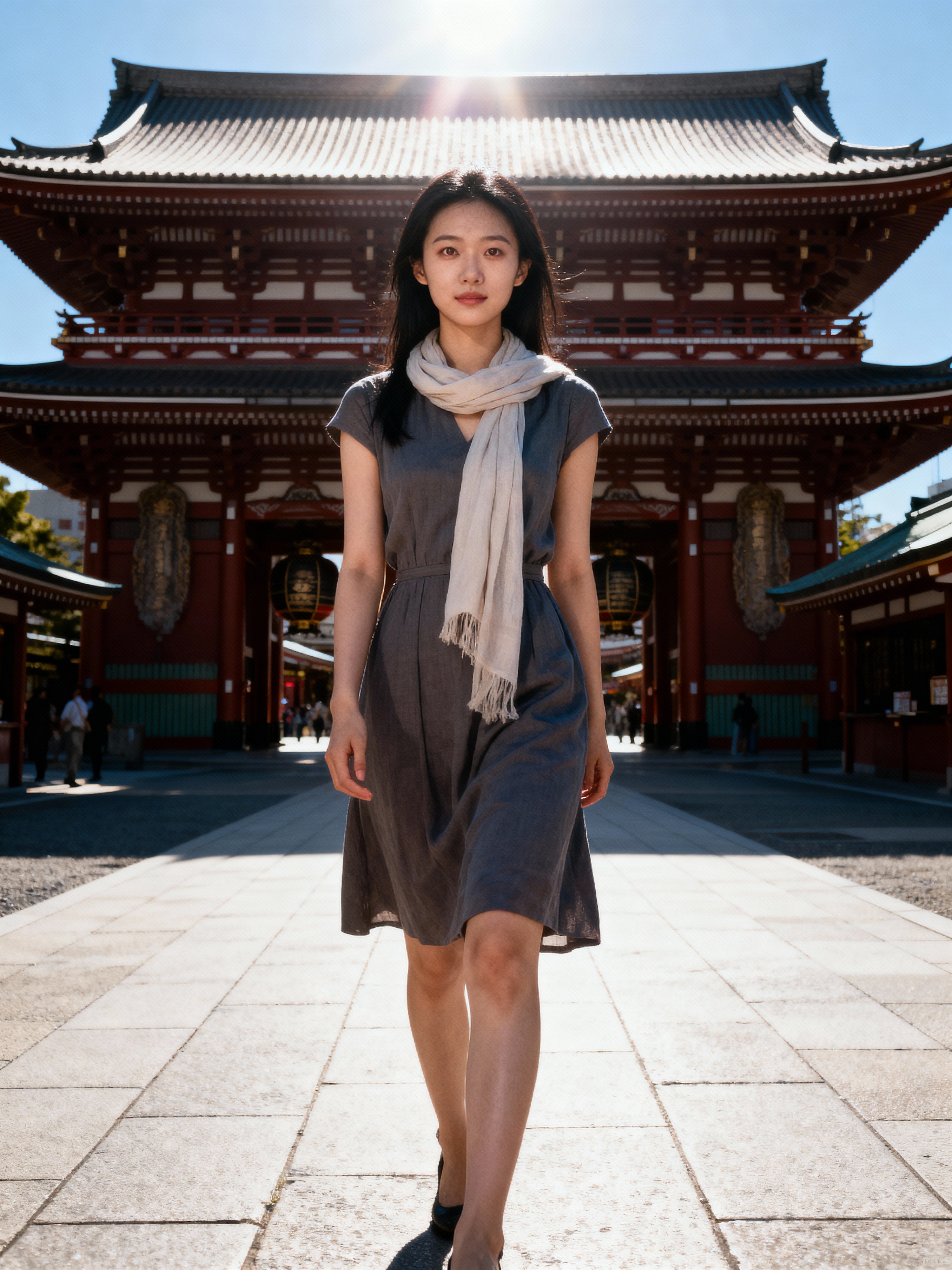model at Asakusa temple, wearing a modest summer dress with light scarf , traditional architecture visible