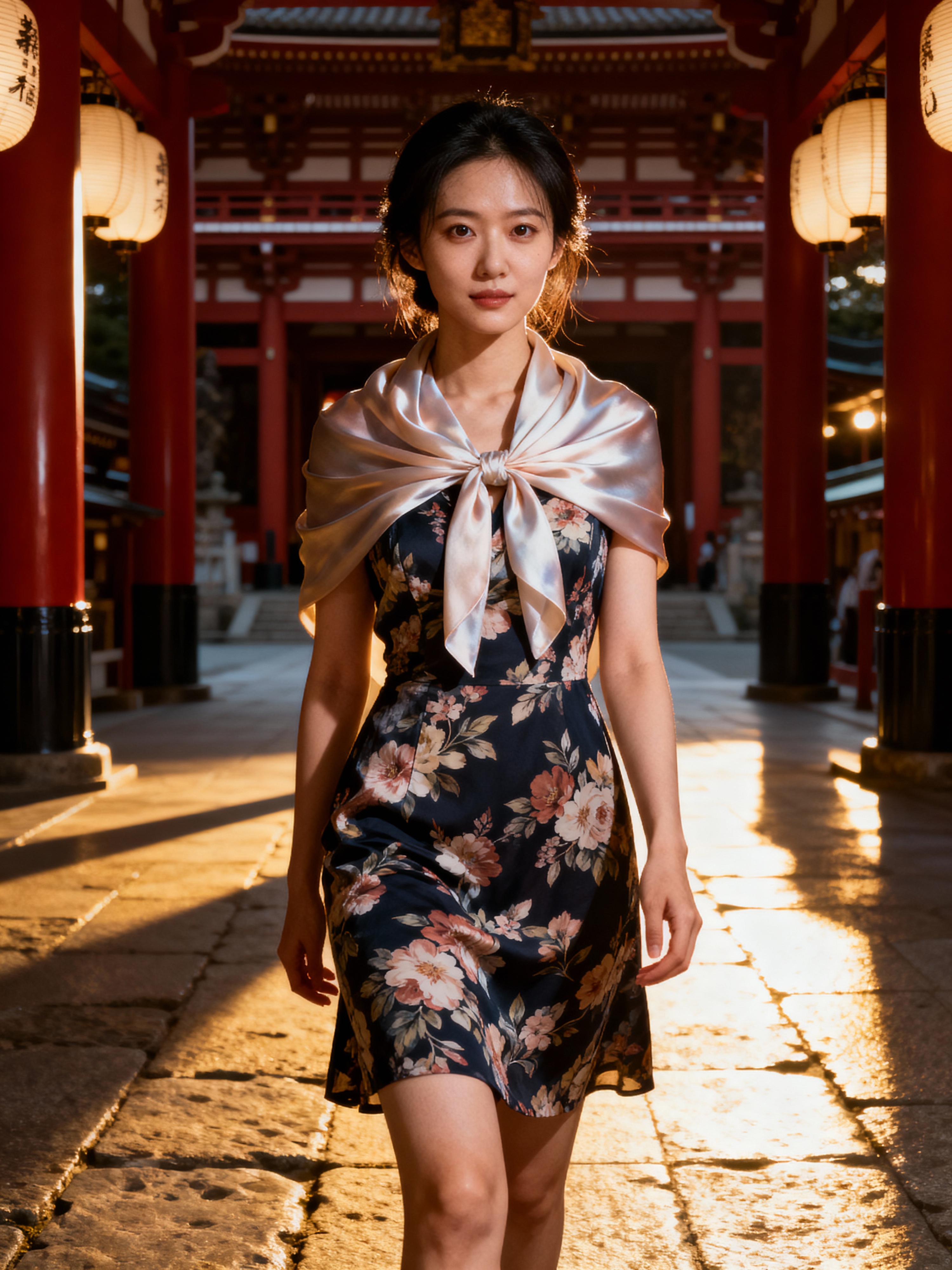 model at Asakusa temple, wearing a modest summer dress with light scarf , traditional architecture visible