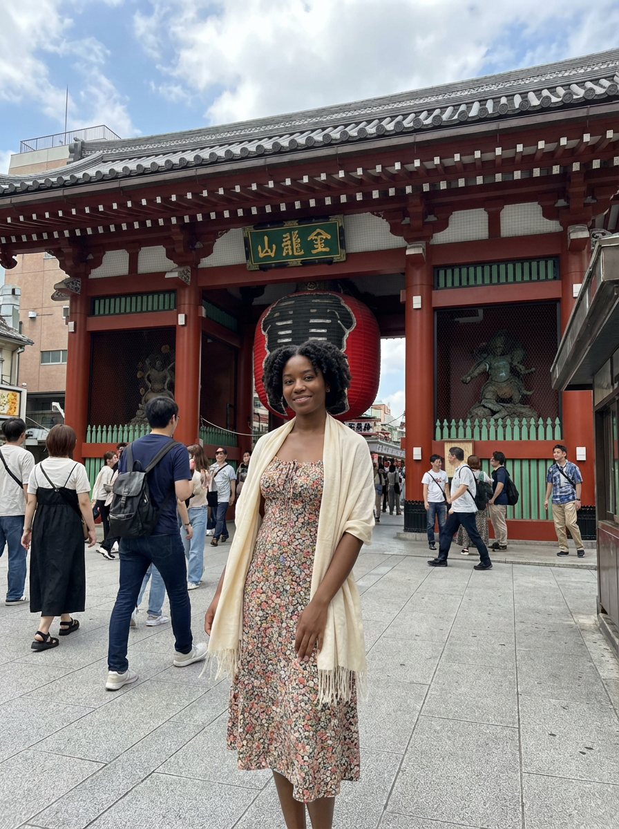 model at Asakusa temple, wearing a modest summer dress with light scarf , traditional architecture visible