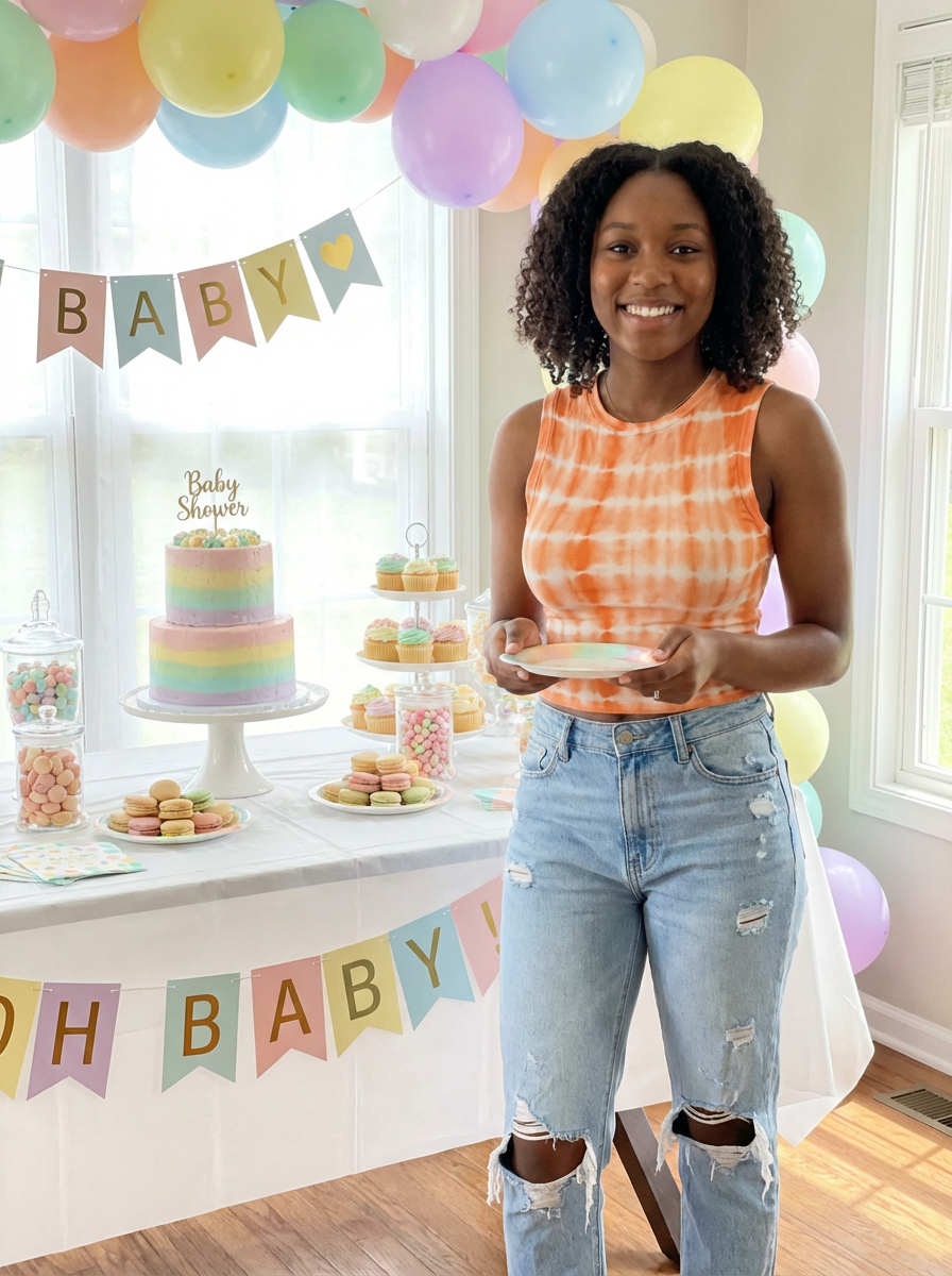 model at baby shower dessert table, beautiful cake and treats, pastel decorations, elegant celebration