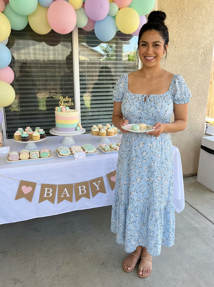 model at baby shower dessert table, beautiful cake and treats, pastel decorations, elegant celebration