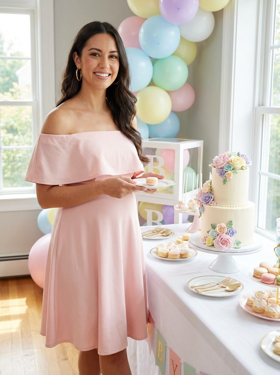 model at baby shower dessert table, beautiful cake and treats, pastel decorations, elegant celebration