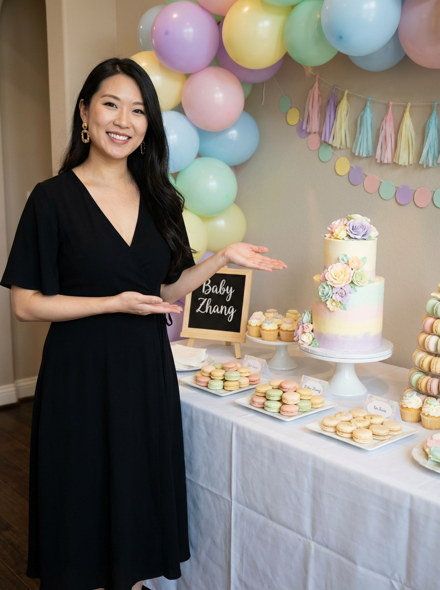 model at baby shower dessert table, beautiful cake and treats, pastel decorations, elegant celebration