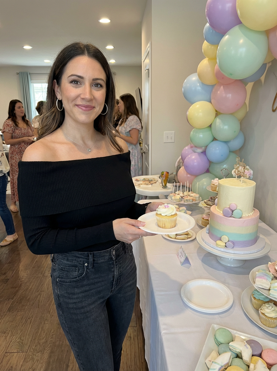 model at baby shower dessert table, beautiful cake and treats, pastel decorations, elegant celebration