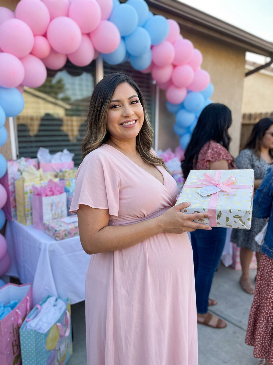 model at baby shower party, beautiful decorations in pink or blue, glowing pregnant mom , gift table visible