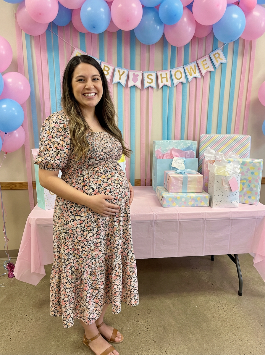 model at baby shower party, beautiful decorations in pink or blue, glowing pregnant mom , gift table visible