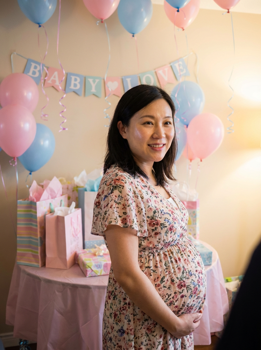 model at baby shower party, beautiful decorations in pink or blue, glowing pregnant mom , gift table visible
