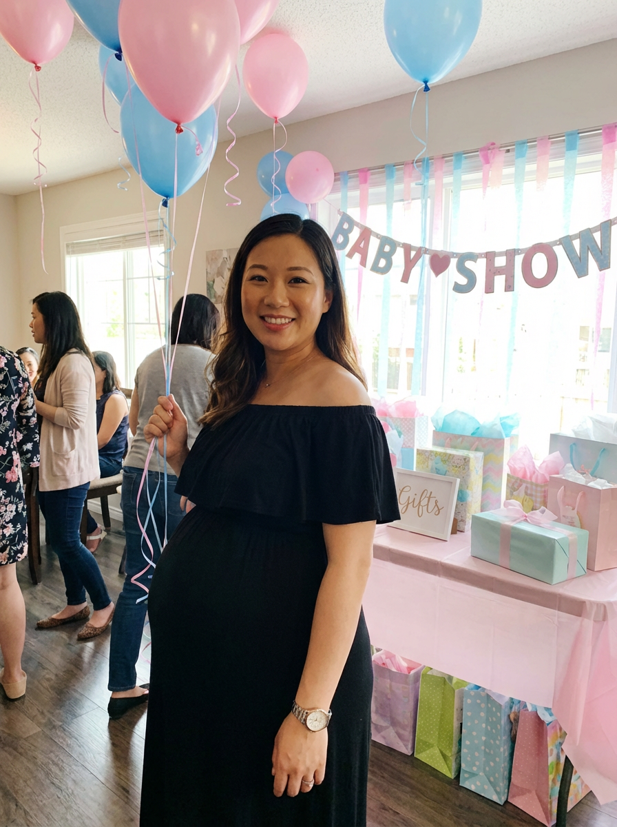 model at baby shower party, beautiful decorations in pink or blue, glowing pregnant mom , gift table visible