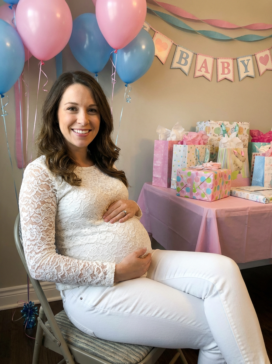 model at baby shower party, beautiful decorations in pink or blue, glowing pregnant mom , gift table visible