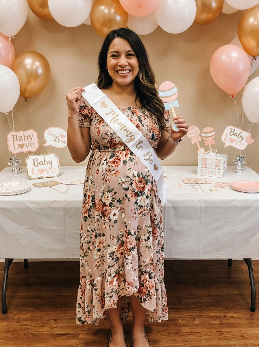 model at baby shower photo booth, cute props, expecting parent glow, fun memories