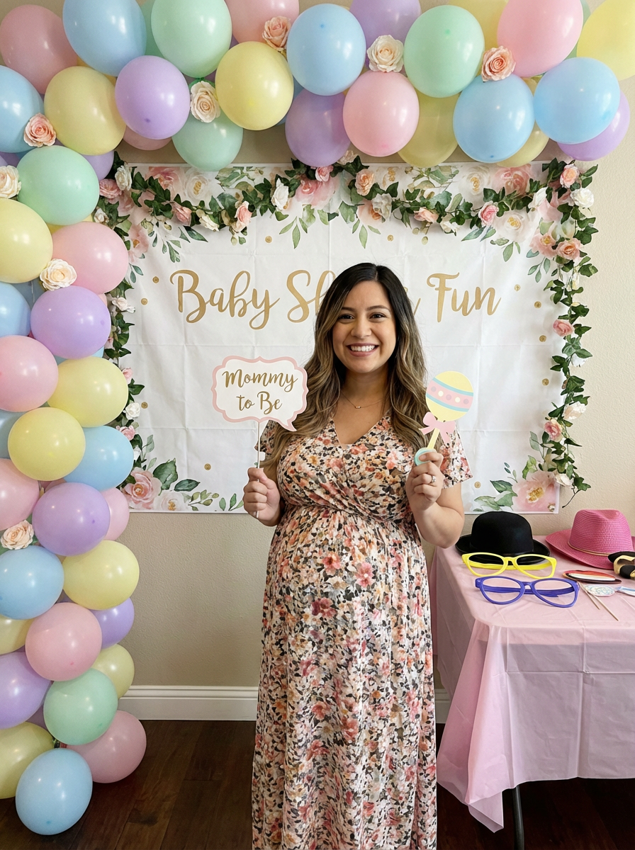 model at baby shower photo booth, cute props, expecting parent glow, fun memories