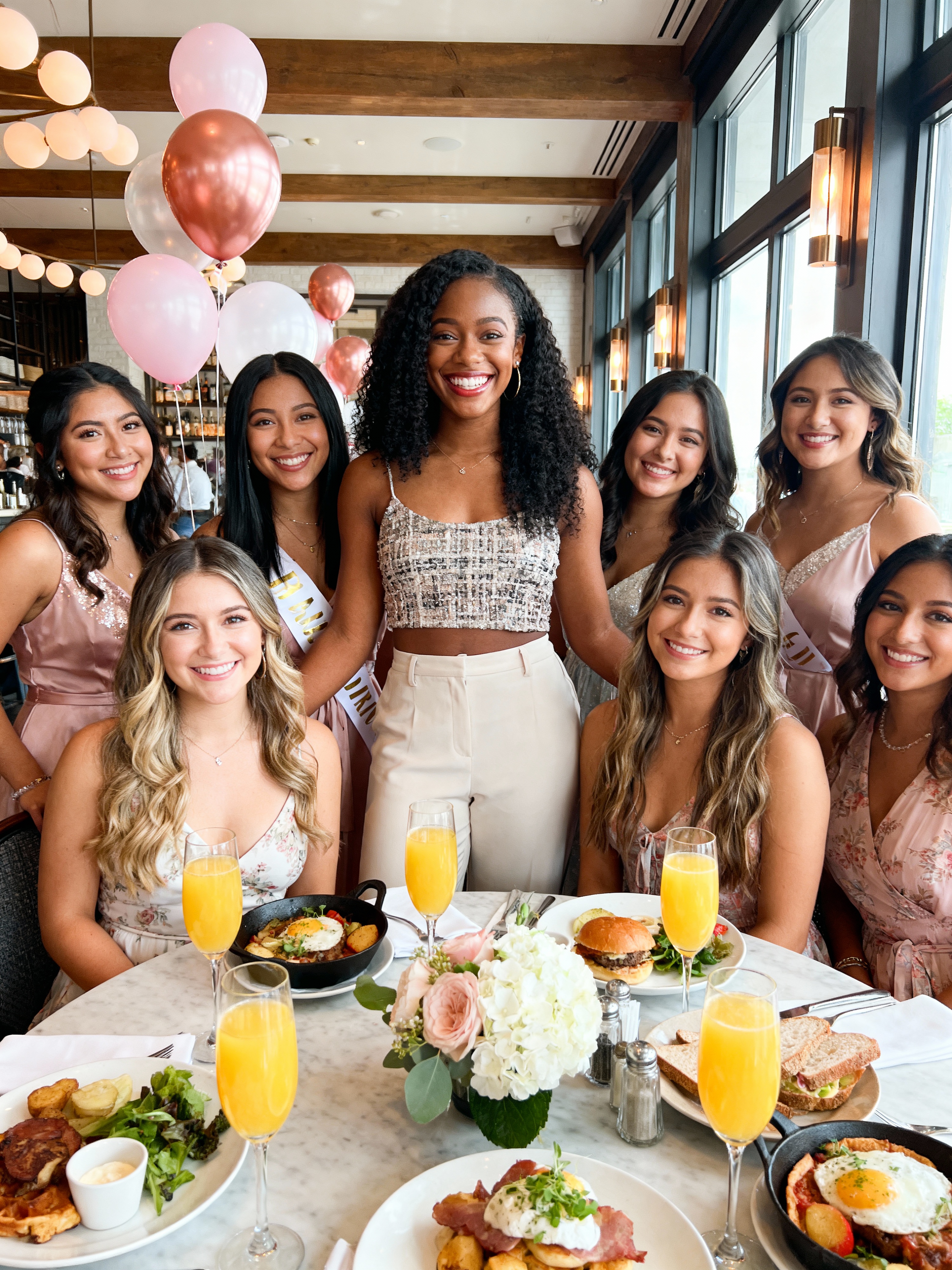 model at bachelorette brunch, bottomless mimosas, bride squad, stylish restaurant setting