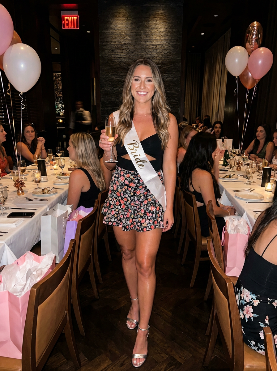 model at bachelorette dinner, fancy restaurant, last single celebration, glamorous evening wear