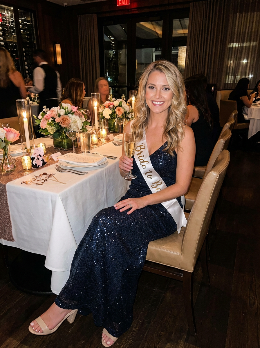 model at bachelorette dinner, fancy restaurant, last single celebration, glamorous evening wear
