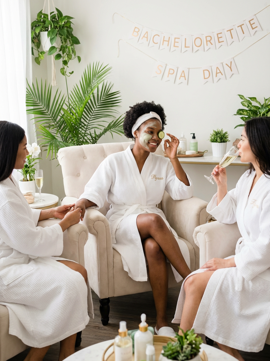 model at bachelorette spa day, matching robes, pampering treatments, relaxation with girlfriends