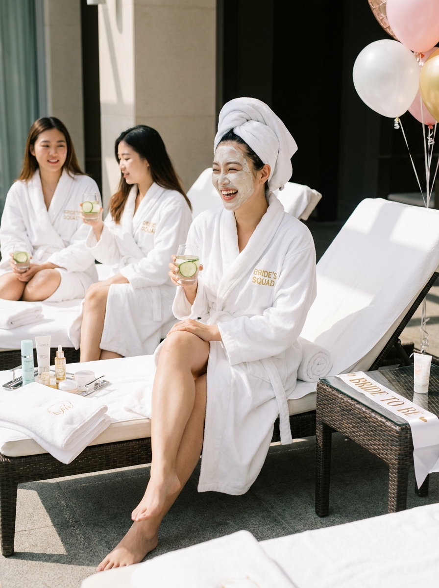 model at bachelorette spa day, matching robes, pampering treatments, relaxation with girlfriends