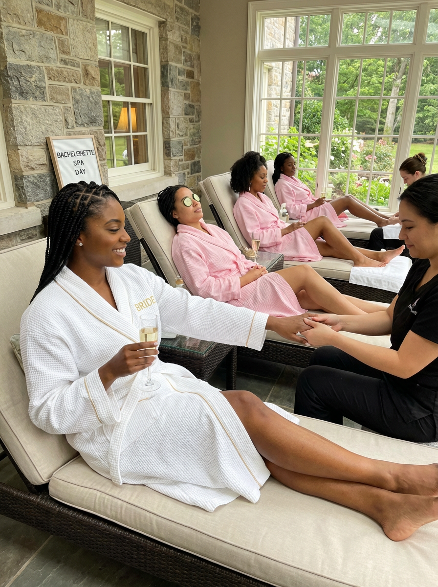 model at bachelorette spa day, matching robes, pampering treatments, relaxation with girlfriends