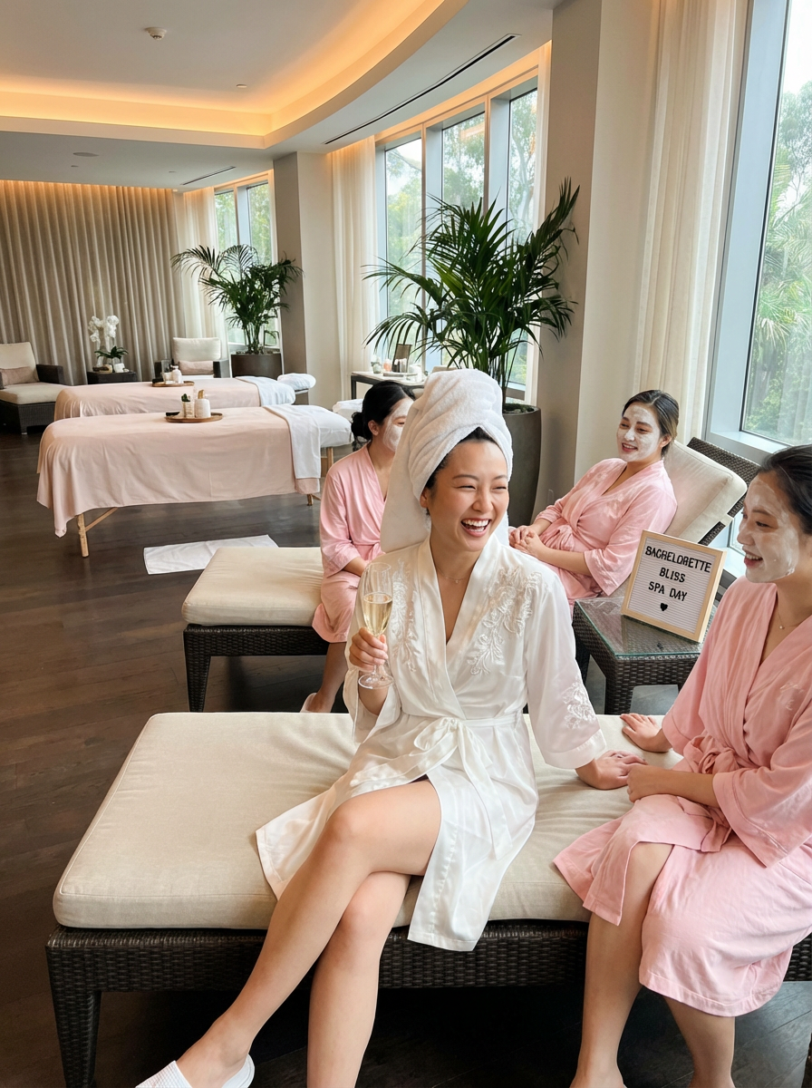 model at bachelorette spa day, matching robes, pampering treatments, relaxation with girlfriends