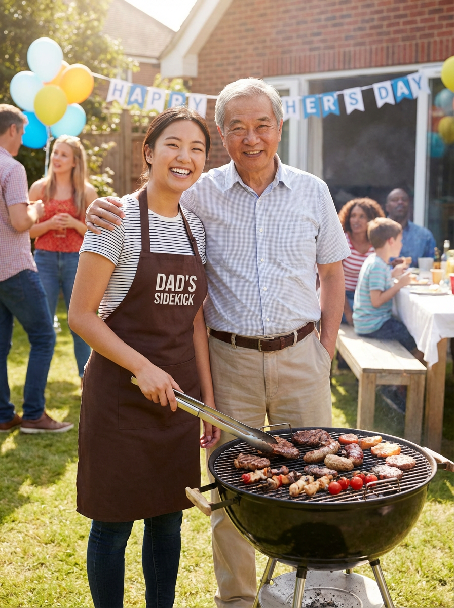 model at BBQ grill, Fathers Day cookout, grilling apron, backyard party setting, proud dad moment