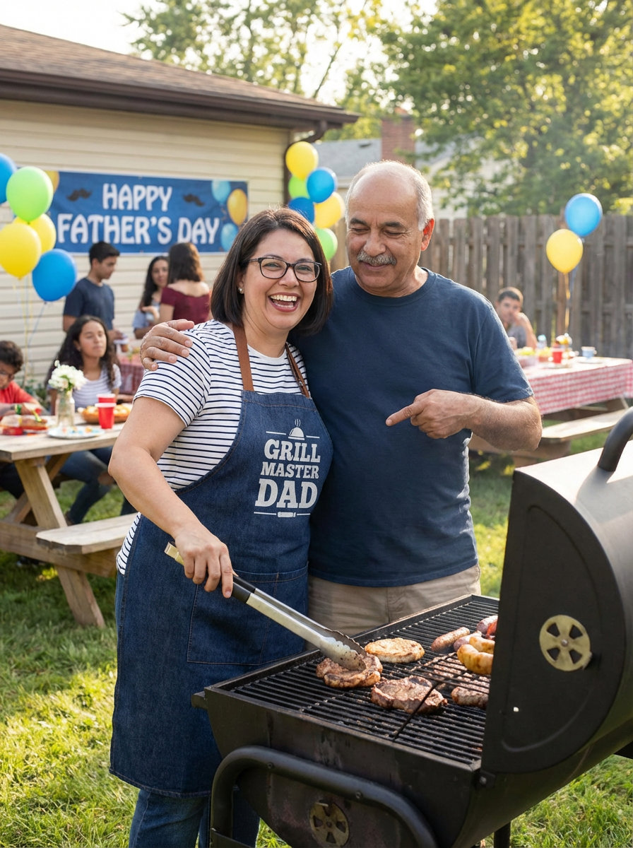 model at BBQ grill, Fathers Day cookout, grilling apron, backyard party setting, proud dad moment