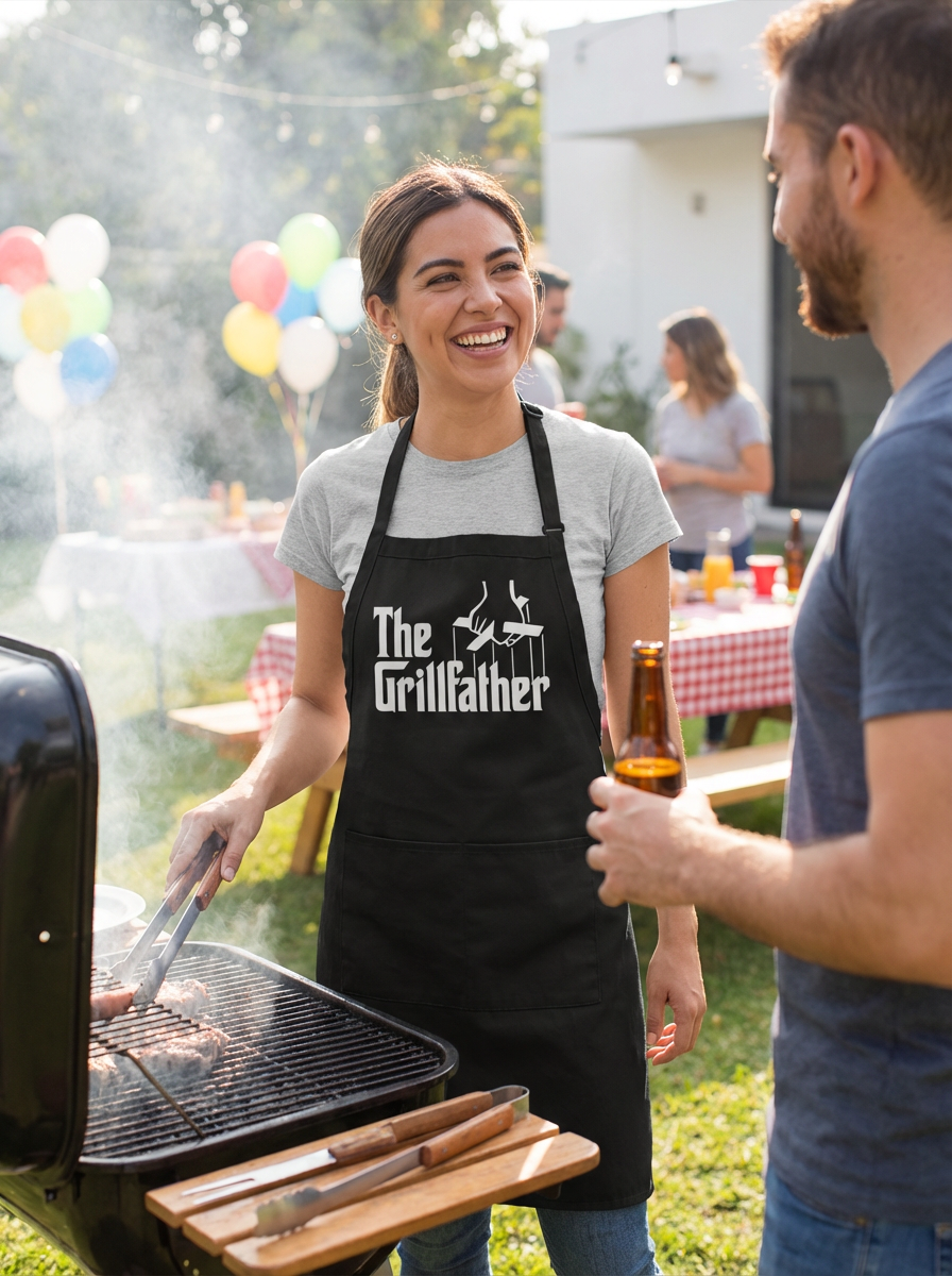 model at BBQ grill, Fathers Day cookout, grilling apron, backyard party setting, proud dad moment